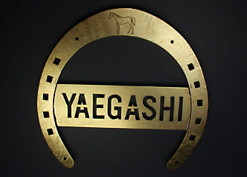 左右14センチの表札です。馬蹄は厚さミリ、名前は厚さ1ミリの真鍮の板で作りました。左右4つの丸い穴はプレートを取り付けるための釘穴です。ウマがとてもお好きな方からの注文で御作り致しました。