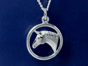 太いシルバーの枠にシャープなホースヘッドを組み込みました。 素材:950シルバー サイズ:丸枠の外形26ミリ、 鎖:50センチ付き、60センチまではご希望の長さで御作り致しますので、ご希望の方は、ショッピングカートのメッセージ欄に書いてください。 書き込みが無い場合は50センチでお届けいたします。