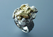 PT900のリングにK18のナゲット風の塊を載せました。クライアントのご希望ですが、ピンキーサイズで40グラムもあります。リングの巾は7ミリで、しっかり重量感があります。さすがプラチナと云ったところです。