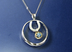 30年前に作ったリングと片方だけのピアス、ご希望で馬蹄を加えてペンダントに、チェーンを付けました。バチカンも手作りです。K18のピアスはポストを曲げて吊り下げてあります。石はアクアマリーン。